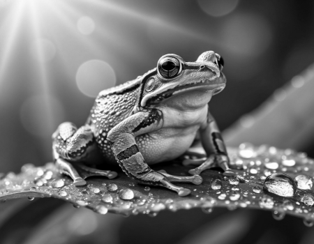 Лягушка греется под лучами солнца, сидя на зеленом листке, покрытом каплями воды после дождя.