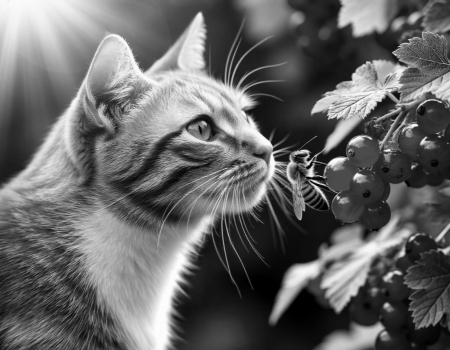 Красивый рыжий кот в саду обнюхивает пчелу, присевшую на ягоды красной смородины.