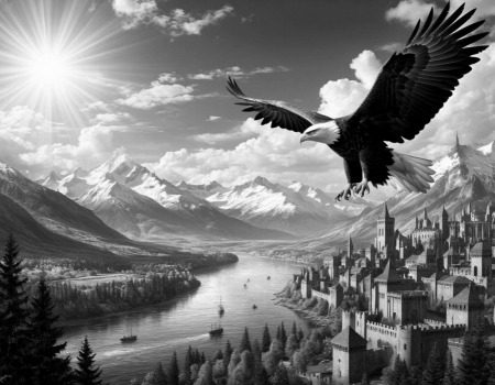 Смелый орел пролетает над замком и крепостными стенами, оглядывая с высоты живописные окрестности средневекового города.